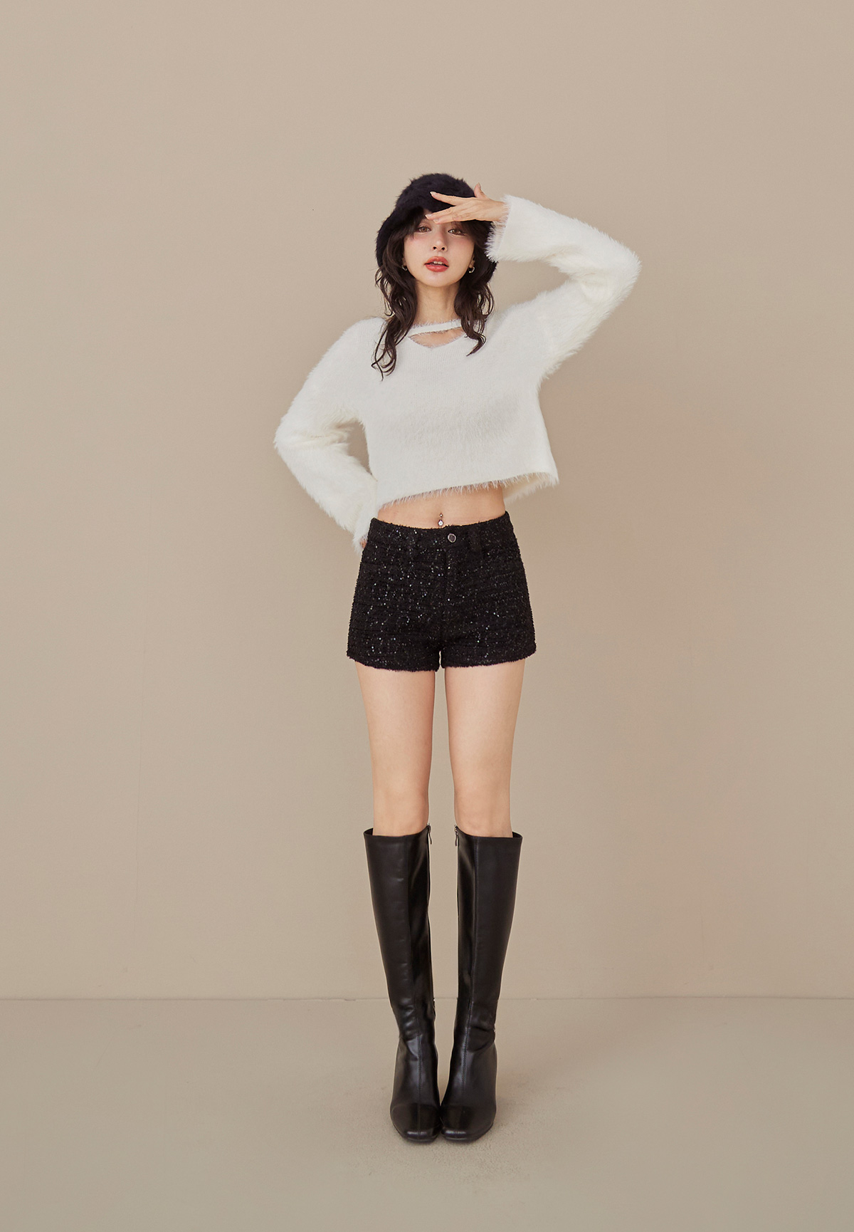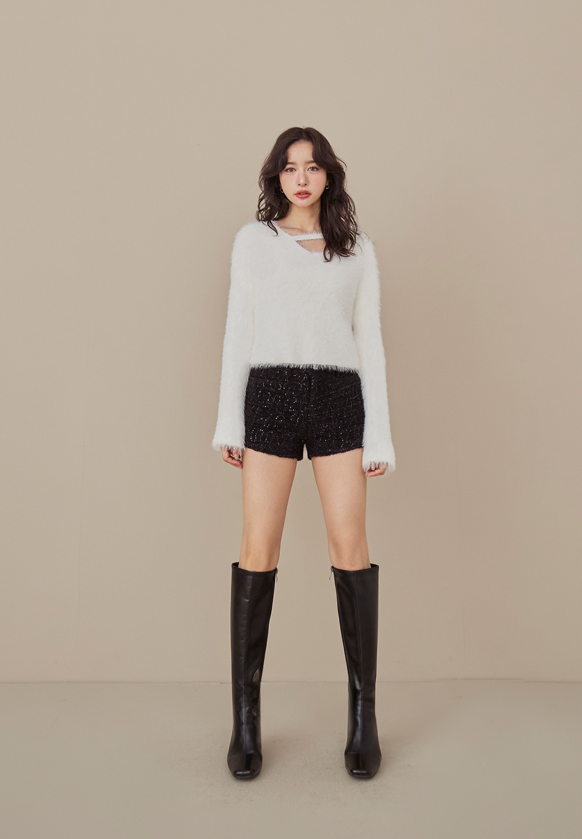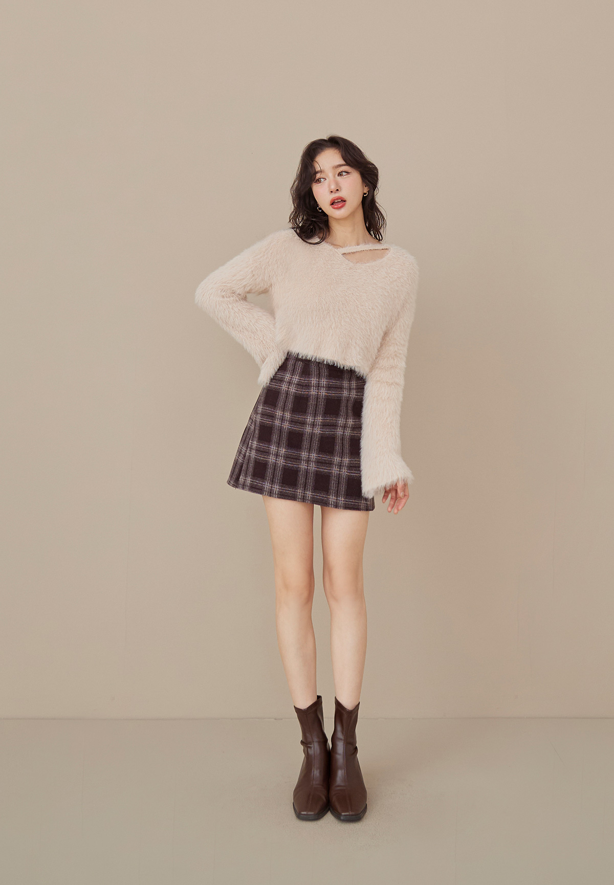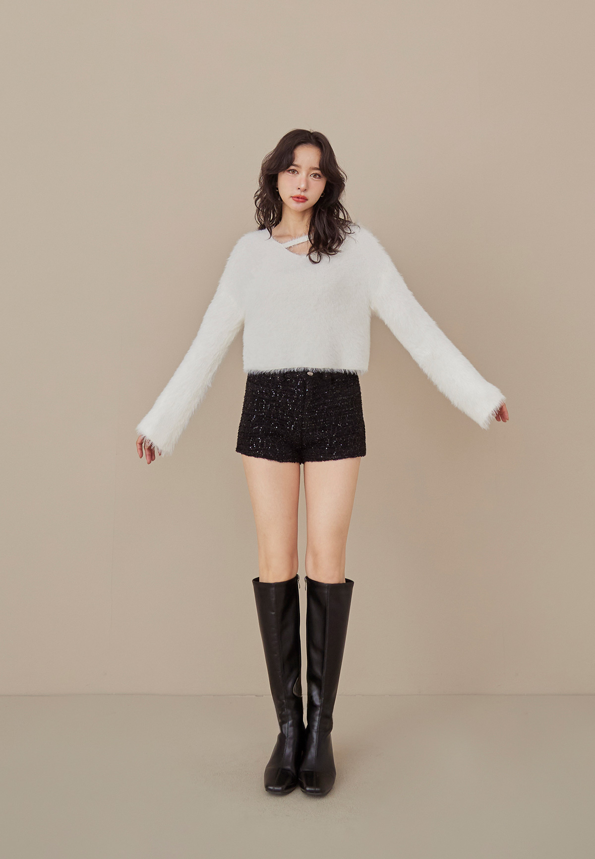 E23冬季小辣妹斜線鏤空水雕毛毛上衣