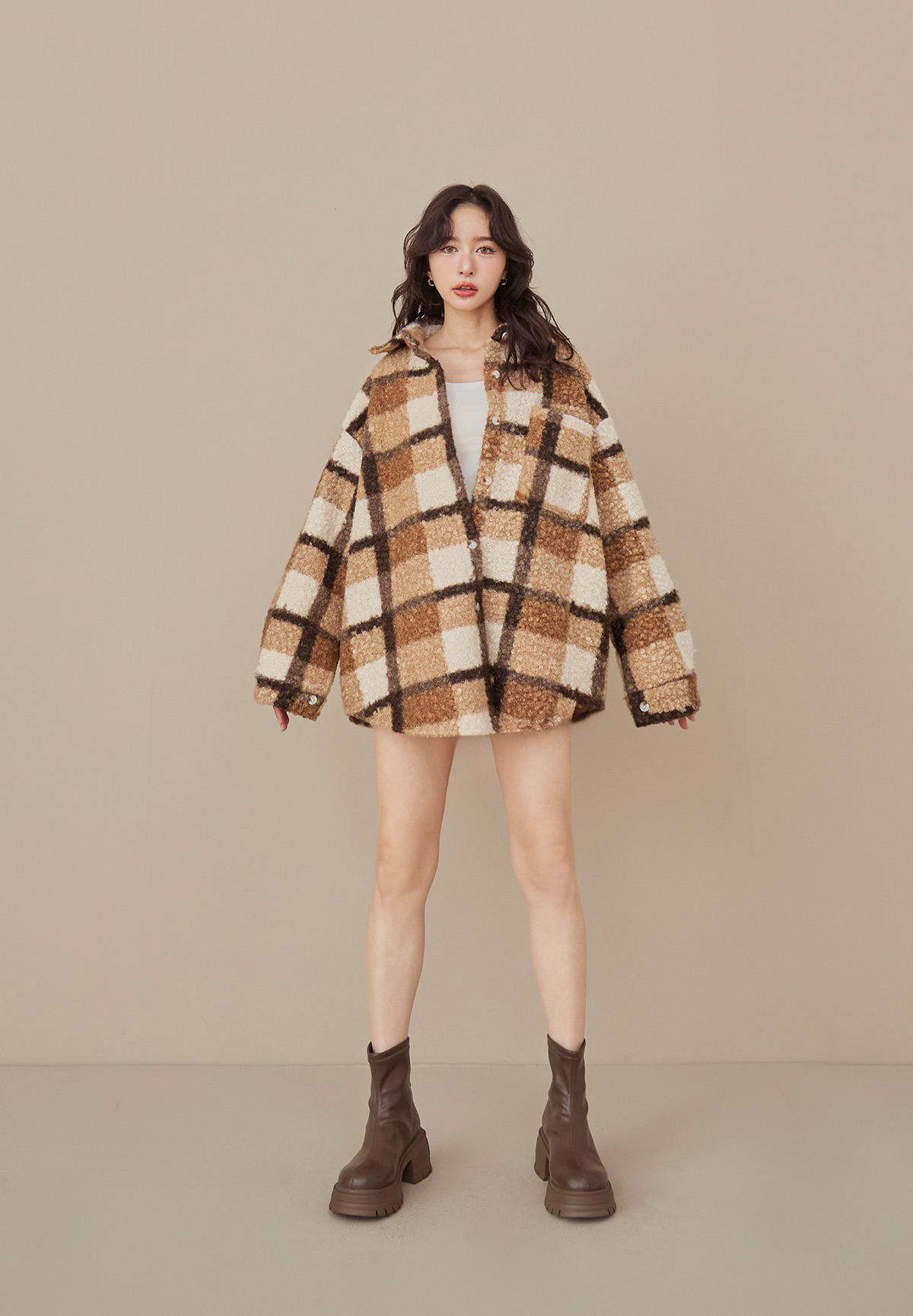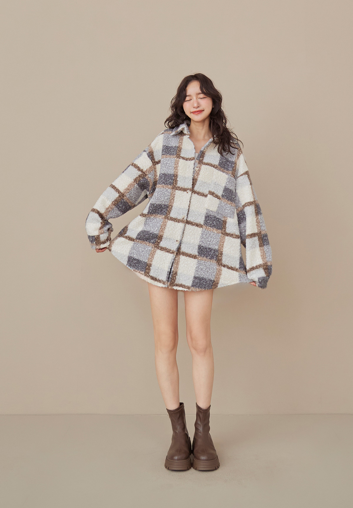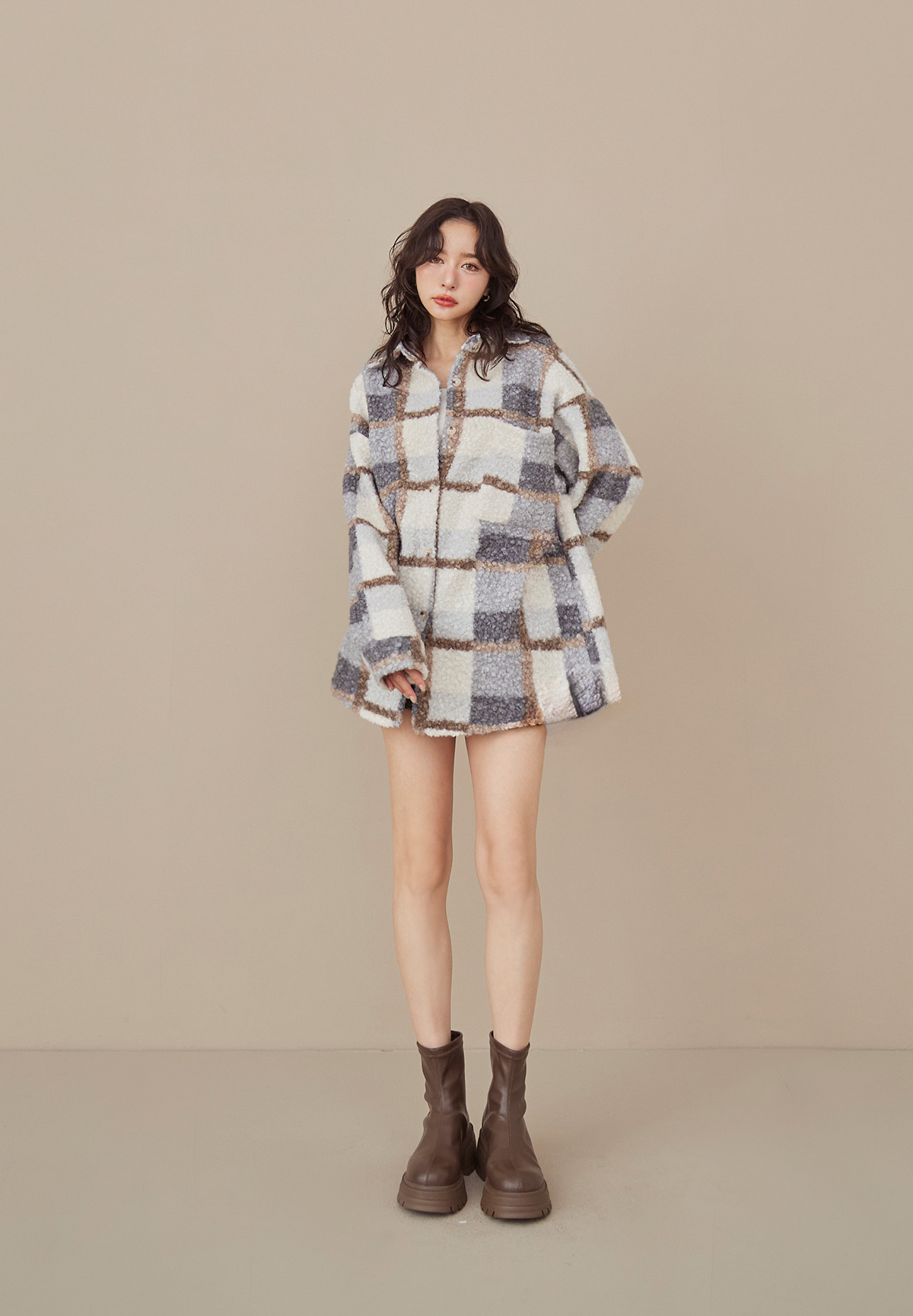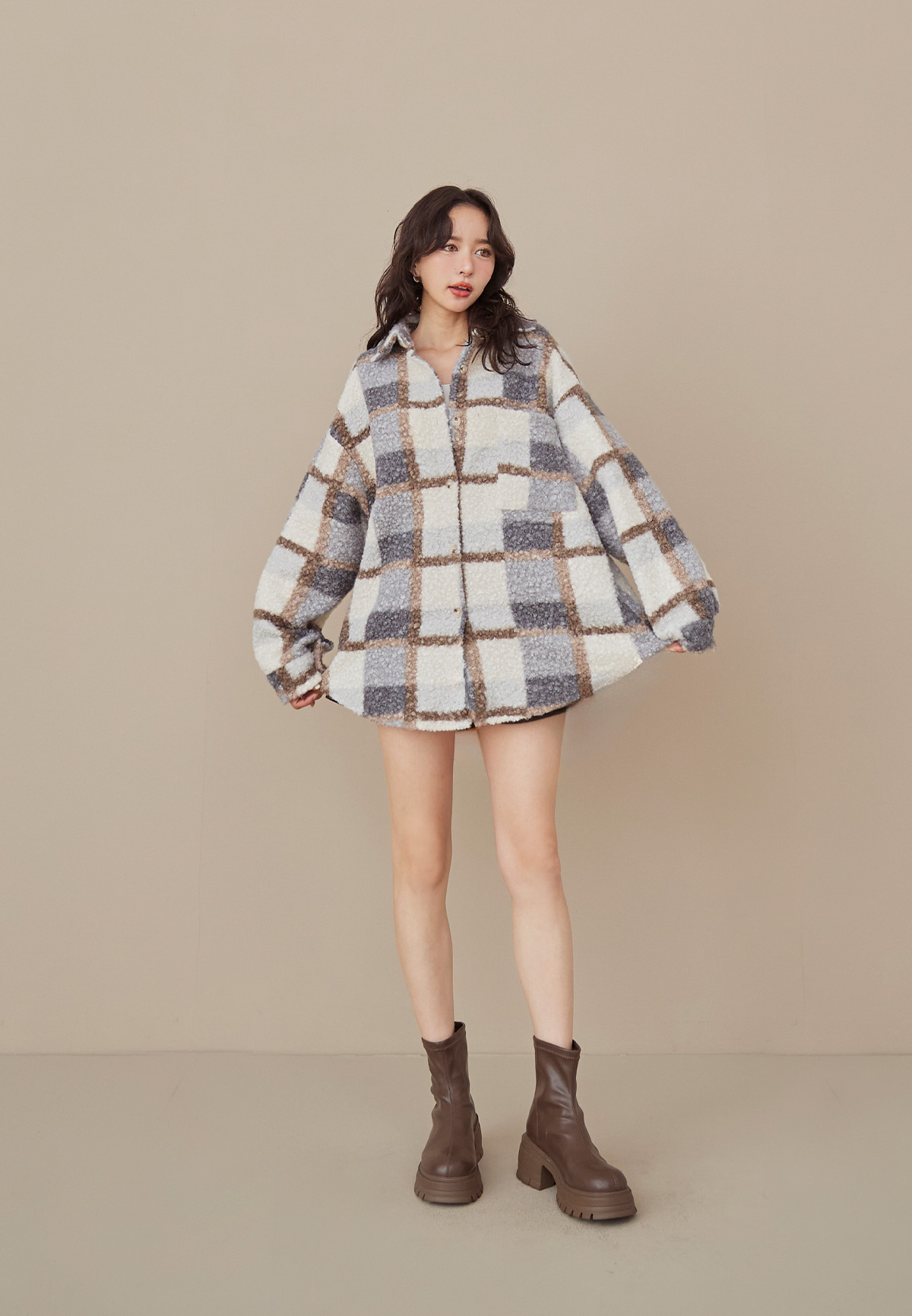 E01熊勾錐!粉彩格泰迪熊QQ毛襯衫/外套(厚片感+刷絨超暖)