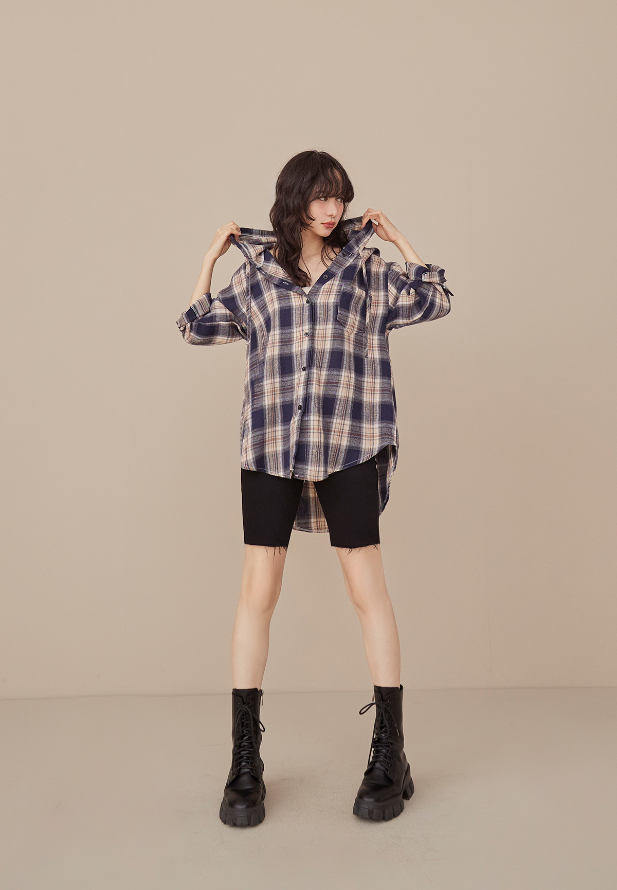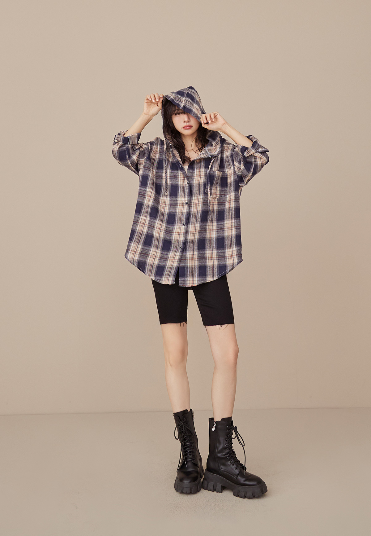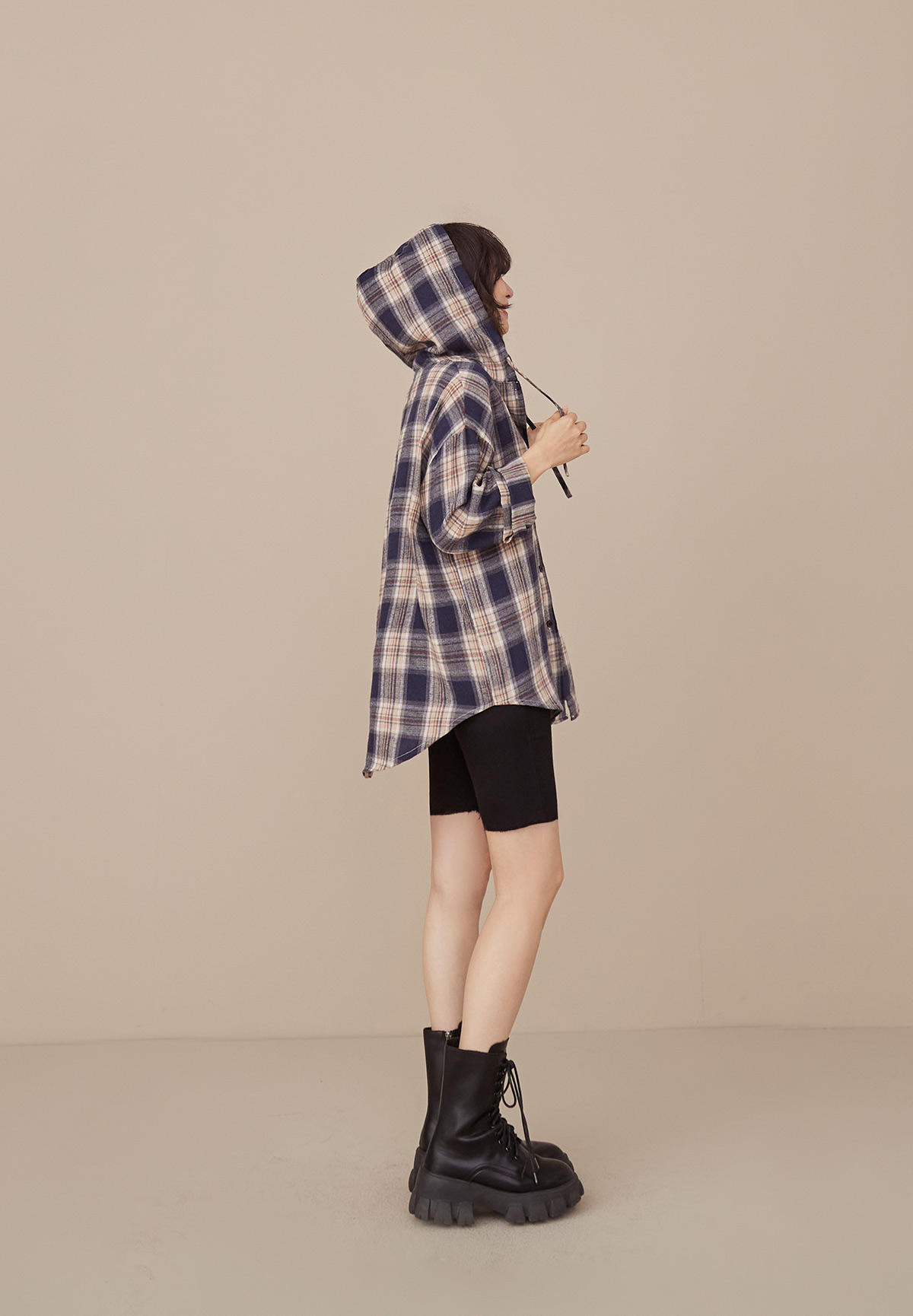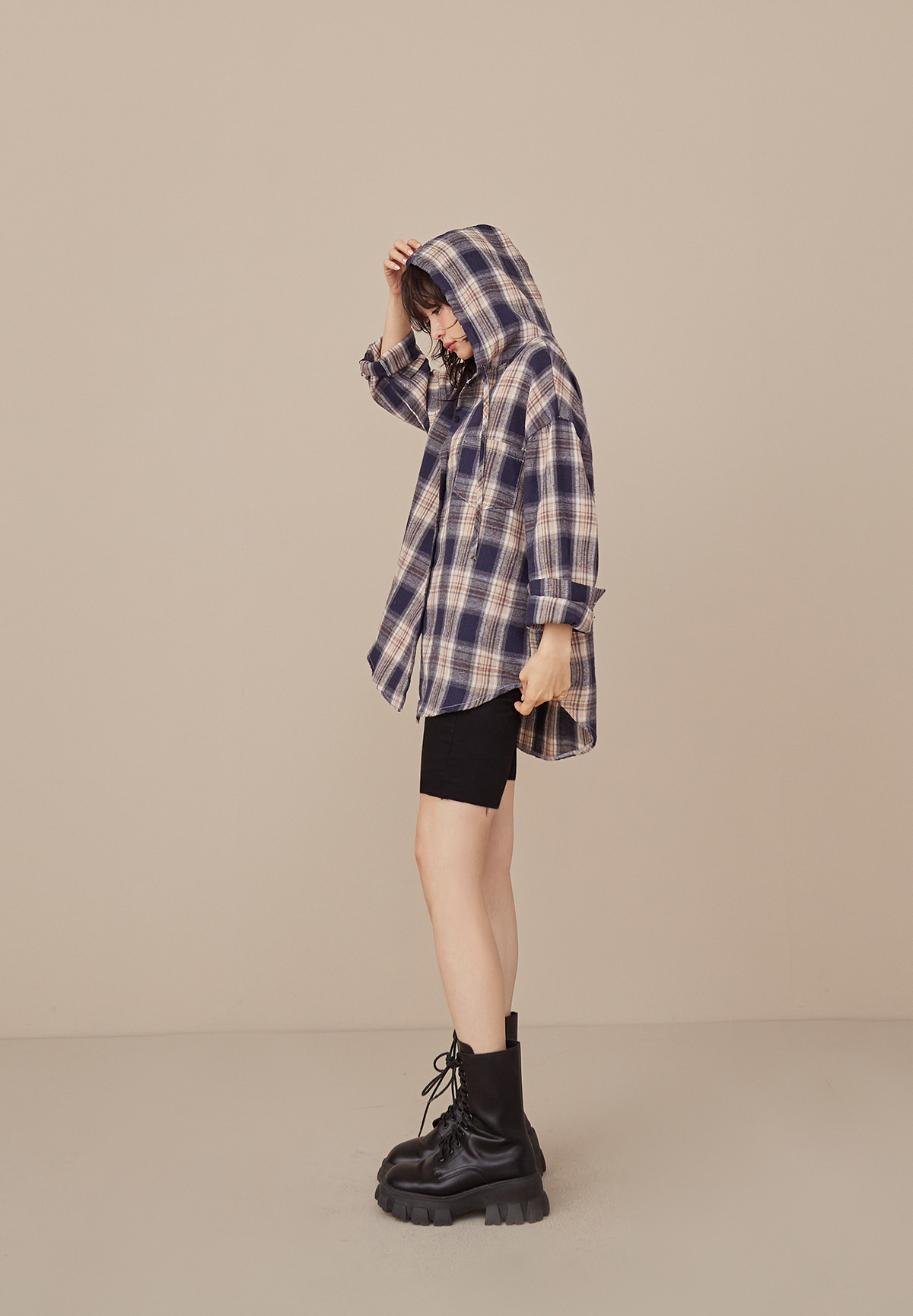 A29率性英倫風格紋抽繩連帽襯衫/罩衫