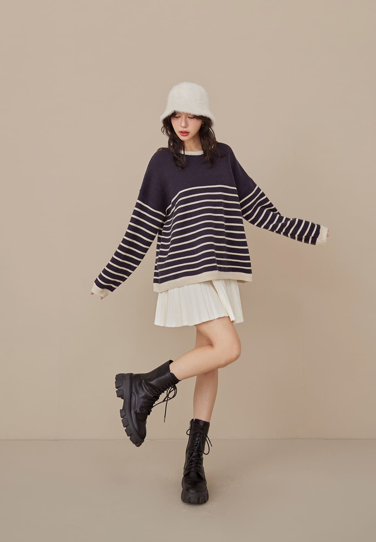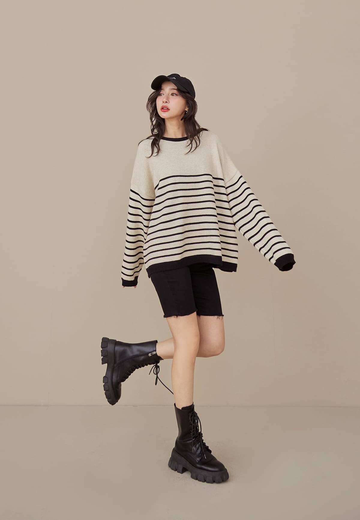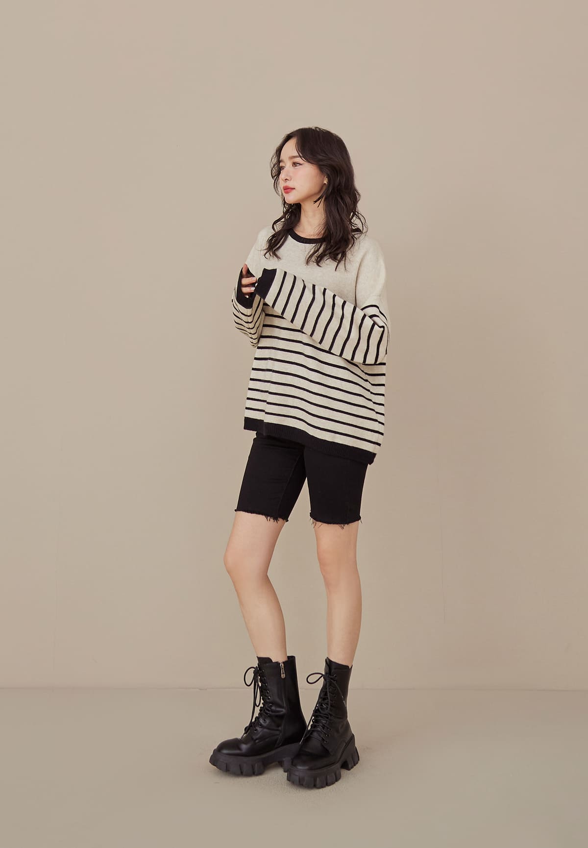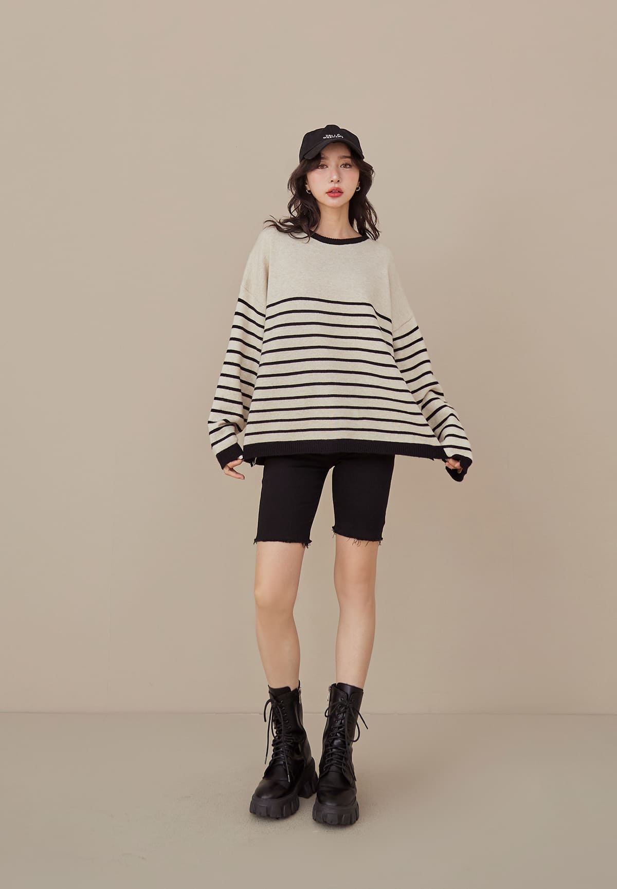 E12鬆弛感穿搭:條紋撞色塊寬鬆針織上衣
